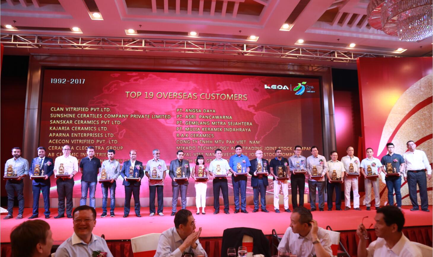 6月1日晚,佛山皇冠假日酒店四樓萬豪廳大廳內外擺滿了酒席,“創新為了您——2017科達全球客戶答謝晚宴”在此隆重舉行。中國輕工業聯合會副會長兼中國陶瓷工業協會理事長杜同和、中國建筑材料聯合會副會長兼中國建筑衛生陶瓷協會會長葉向陽、中國國際貿易促進委員會建筑材料行業分會副會長王耀和周治洲、中國陶瓷工業協會秘書長侯文全及副秘書長樊瑞新、中國建筑衛生陶瓷協會副秘書長尹虹、中國建筑衛生陶瓷協會副秘書長宮衛、中國陶瓷工業協會建筑衛生陶瓷專業委員會秘書長黃芯紅、廣東省建筑材料行業協會創會會長吳一岳、廣東陶瓷協會會長陳環和秘書長陳振廣、佛山市陶瓷行業協會秘書長羅青、佛山市建材行業協會秘書長孔海發以及媒體代表、國內外客戶1500余人出席盛會。今年晚宴的分主題為“科達制式利全球  一帶一路齊共享”,以科達為代表的中國制式正惠及全球越來越多的國家,科達愿與客戶及合作伙伴一道共享一帶一路的碩果。