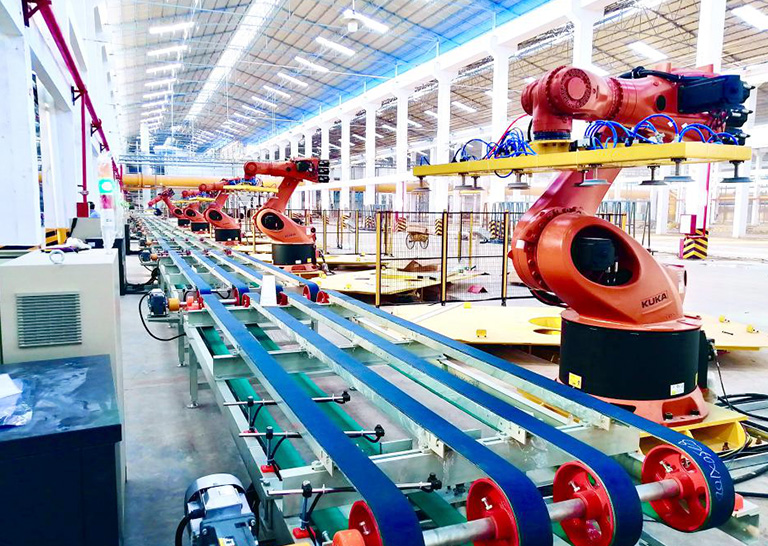 近年來,陶瓷市場巖板、大板需求火爆,使得陶瓷行業的產品一直向大尺寸邁進,巖板和大板產品的出貨不同于常規小尺寸產品的大批量出庫模式,往往采用小批量多批次拼托模式出貨。需要在出庫前把不同批次的磚拼托出庫。并且由于巖板和大板的大尺寸,導致人工分揀碼放困難。科達針對這些需求推出了機器人揀磚線。